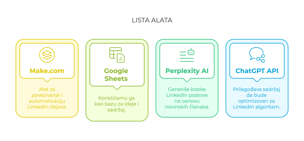 Za ovu automatizaciju koristićemo Make.com, Google Sheets, ChatGPT API i Perplexity AI.